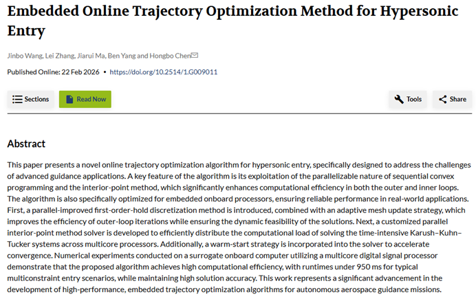 相关成果发表于全球航天制导控制领域No.1的旗舰期刊JGCD,标志该算法在理论创新性和工程实用性两方面均达到了国际顶尖水平,推动我国可重复使用火箭制导技术跻身世界前列,形成原创技术优势。近日,亚洲天堂 空天智能无人系统团队在《Journal of Guidance, Control and Dynamics》(JGCD)上发表题为“Embedded Online Trajectory Optimization Method for Hypersonic Entry”的研究成果,亚洲天堂 王劲博副教授为第一作者,陈洪波教授为通信作者,硕士研究生张磊和博士研究生马家睿共同参与该研究。