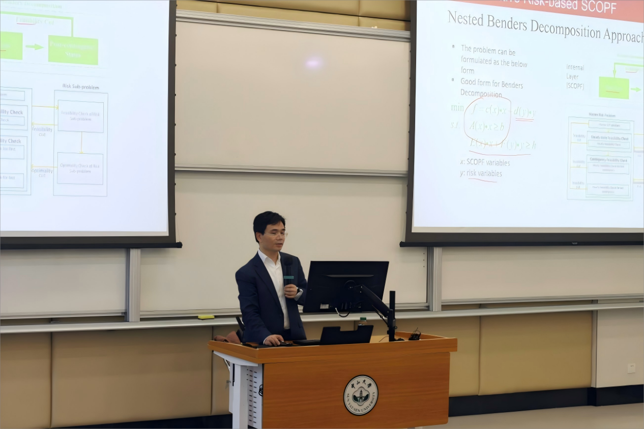 报告伊始,王钦副教授结合个人在美国电网公司、科研院所及香港理工大学的工作经历,简要介绍了当前新型电力系统的发展背景。他指出,随着可再生能源高比例接入,以及电动汽车、虚拟电厂等新型负荷的快速发展,电力系统正从传统的“单向输电”模式,转变为高度耦合、强不确定性的复杂系统,这对安全稳定运行和经济调度提出了更高要求。围绕“如何在不牺牲安全性的前提下降低系统运行成本”这一核心问题,王钦副教授通过典型算例,介绍了国内外在新型电力系统调度领域的最新进展和典型思路,帮助同学们全面把握相关研究。